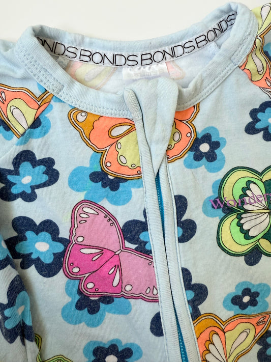 Bonds Wondersuit Blue & Colourful Butterflies Sleeper Romper (3-6 Months)