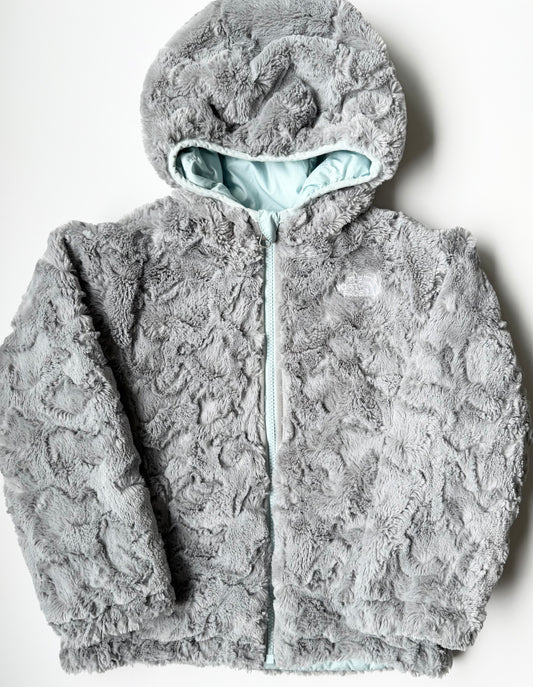The North Face Mossbud Swirl Light Blue & Grey Fuzzy Reversible Winter Jacket (5T)