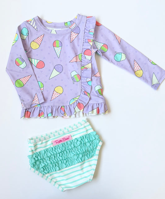 Ruffle Butts Purple Snow Cones Long Sleeve Top & Mint Stripped Bottoms Two Piece Swimsuit - New (2T)